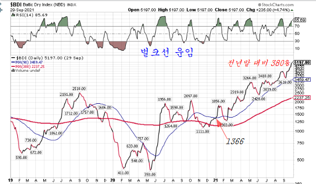 지난 연말 1366수준에 머물던 벌크선의 운임지수(BDI 지수)는 현재 5197로 지난 연말 대비 3.8배가 올라 있다.