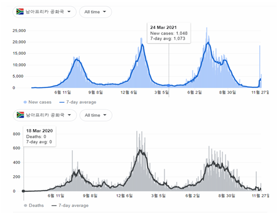 쥬라기: 새로운 변동 바이러스의 진원지인 남아프리카공화국의 확진자 수와